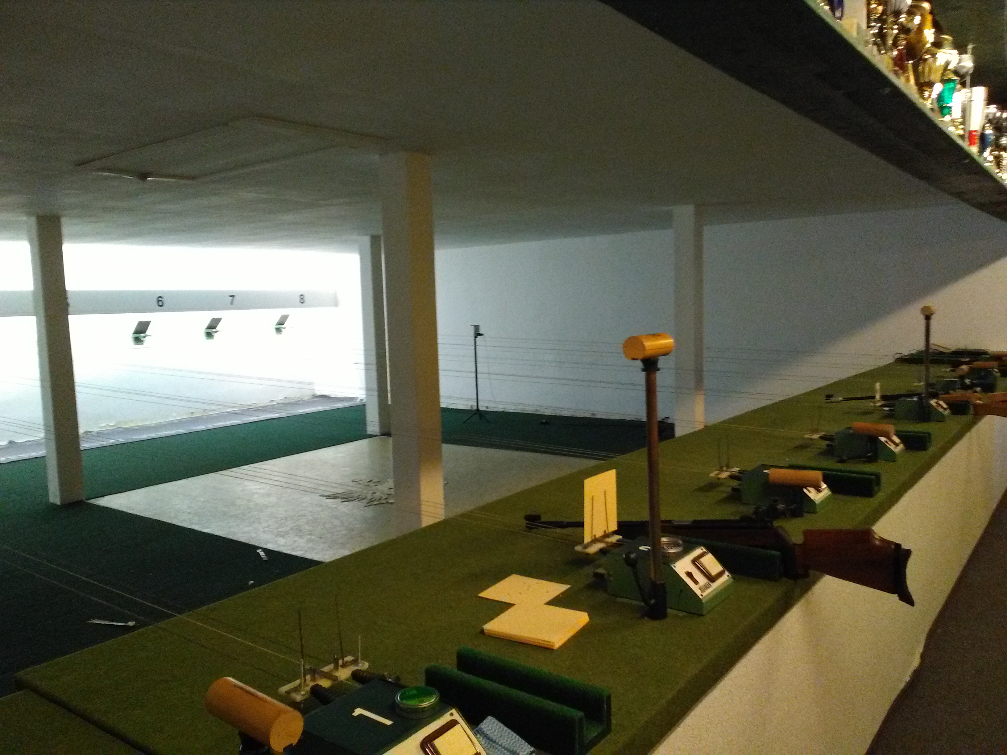 Wir verfügen über einen Indoor-Luftgewehrstand mit acht 10m-Bahnen, jede ausgestattet mit einem motorisierten Scheibenzug.